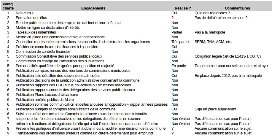 Alors Montpellier journal a décidé de faire un point précis – qu’Anticor n’a visiblement pas fait alors que sa soirée était intitulée « la charte Anticor à l’épreuve de la réalité » – dont voici le résultat. Pour éviter des erreurs, le tableau ci-dessous a été envoyé à la ville de Montpellier et à Anticor dès lundi en leur demandant de nous signaler des erreurs. Nous n’avons pas eu de retours même si Christophe Hébert d’Anticor Hérault nous avait promis un retour mardi. Sur 26 points, 13 n’ont pas été réalisés et seulement deux ont été totalement réalisés par Philippe Saurel : le non-cumul des mandats et la présidence de la commission des finances à l’opposition. Pour le détail des autres, voir ci-dessous :